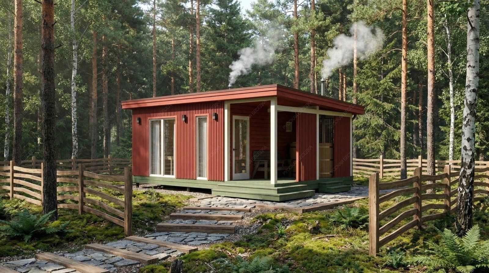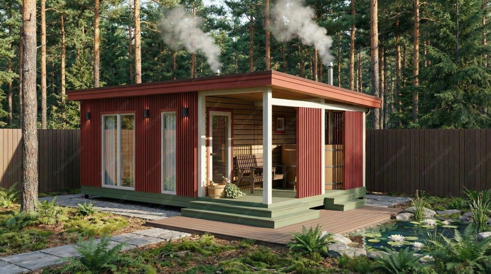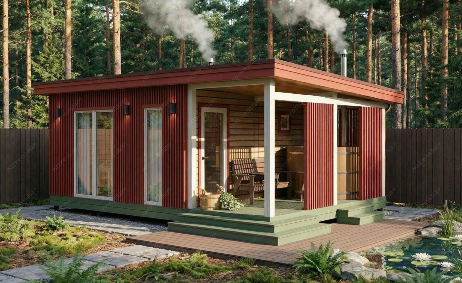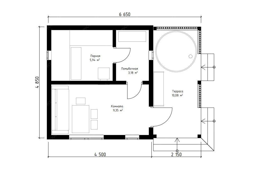 Баня «Ортея» — это гармоничный симбиоз классической русской традиции и современного подхода к загородному отдыху. Конструкция с открытой террасой создает идеальный баланс между динамикой парных процедур и спокойным расслаблением на свежем воздухе. После целебного жара парной так приятно выйти на просторную террасу площадью 10,08 м², чтобы насладиться тишиной и окружением природы.  Планировка продумана для максимального удобства. Просторная парная площадью 5,94 м² с классическим деревянным окном-форточкой обеспечивает идеальный микроклимат и мягкий, контролируемый пар. Отдельная помывочная зона (3,18 м²) и уютная комната отдыха (9,35 м²) позволяют комфортно провести время всей компанией. Односкатная крыша и выверенные пропорции строения (4,5х4,85 м + терраса 2,15х4,85 м) придают проекту выразительный, современный вид.  Качество исполнения и натуральные материалы гарантируют долговечность, отличное теплосбережение и неповторимую атмосферу, где каждая деталь работает на ваше удовольствие и релаксацию. Это не просто постройка, а готовое решение для создания вашего личного центра wellness на собственном участке.