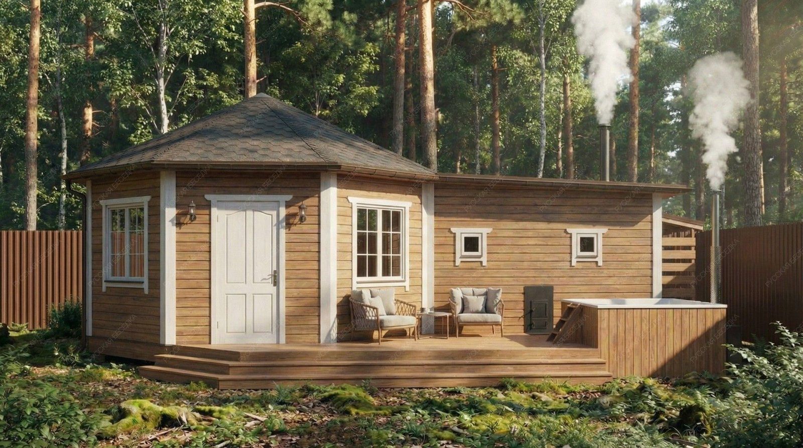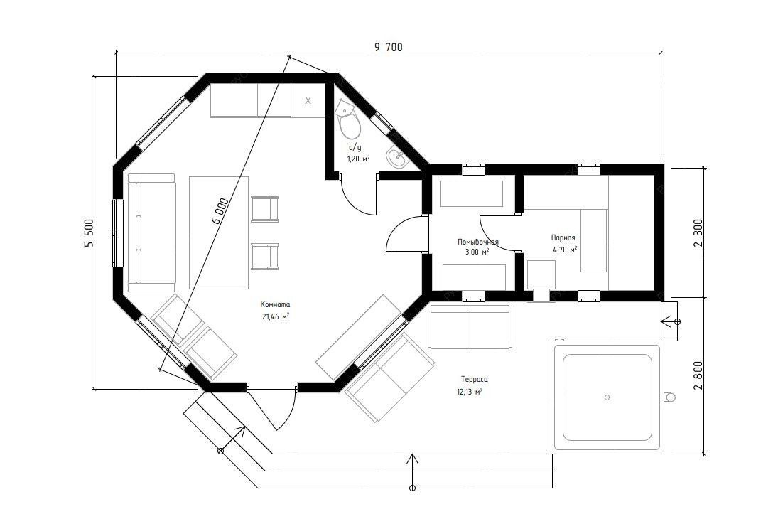 Баня «Терция» предлагает уникальное архитектурное решение, центральным элементом которого является просторная восьмигранная комната отдыха площадью 21,46 м². Такая форма создает особую, уютную атмосферу для общения и релаксации, делая интерьер запоминающимся и визуально выразительным.  Функциональные зоны тщательно продуманы. Парная (4,7 м²) оснащена двумя окнами-форточками, что обеспечивает превосходный контроль за паром и вентиляцией. Отдельная помывочная комната поддерживает чистоту и удобство. Открытая терраса площадью 12,13 м² логично дополняет комплекс, предусматривая специальное место для установки купели, что создает идеальные условия для контрастных процедур.  Классическая восьмискатная крыша и солидные габариты основного строения (5,5х9,7 м) формируют представительный внешний облик. Качественное исполнение из отборной древесины гарантирует долговечность, эффективное сохранение тепла и создание той целебной микросреды, которая является сутью настоящей русской бани. Этот проект идеально подходит для тех, кто ценит не только функциональность, но и оригинальность архитектурных форм в организации пространства для отдыха.