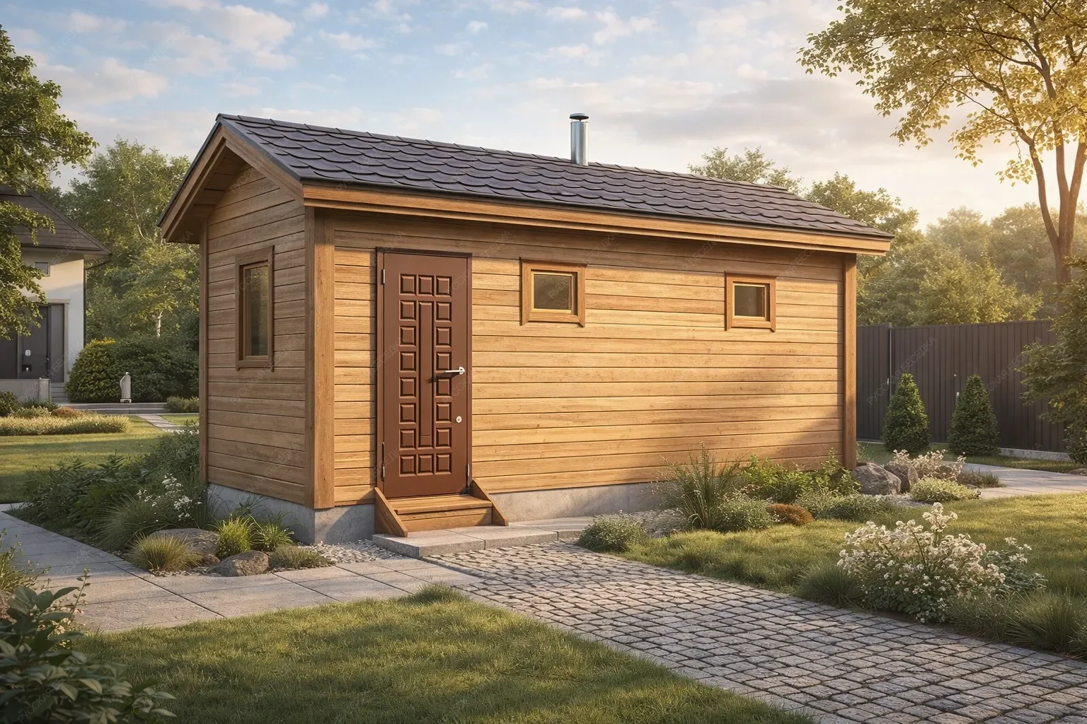 Мобильная баня «Мини 2» с двухскатной крышей предлагает компактное и полностью укомплектованное решение площадью 11,5 кв.м. при габаритах 5х2,3 метра. Её вытянутая форма позволила реализовать эффективную линейную планировку, последовательно включающую три функциональные зоны: парную, душевую и раздевалку. Такая организация пространства обеспечивает логичный и комфортный переход между этапами банного ритуала, от процедур к отдыху. Стандартное остекление гарантирует достаточный уровень естественного освещения, сохраняя классический внешний вид и оптимальные теплоизоляционные свойства. Двухскатная крыша обеспечивает устойчивость конструкции и эффективный сход атмосферных осадков. Главным преимуществом модели является её мобильность, позволяющая быстро установить готовый комплекс на любом подготовленном участке без капитальных затрат на фундамент. Данное решение оптимально для небольших территорий, сезонного использования или в качестве дополнительной гостевой парной, где важны полная автономность, функциональность и быстрая готовность к эксплуатации.