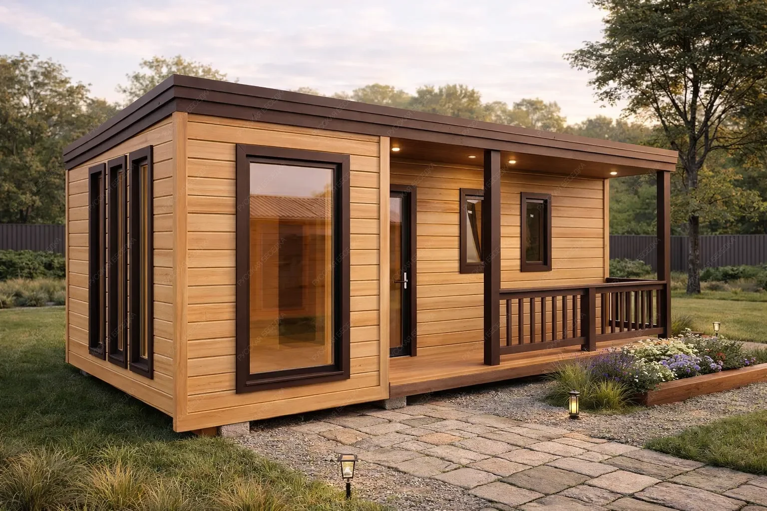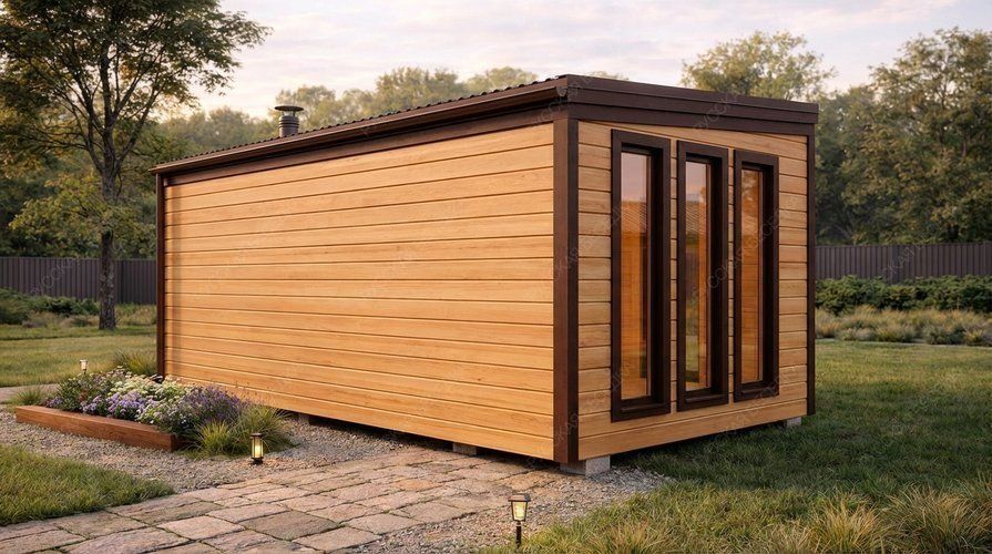 Каркасная мобильная баня «Свежь» с габаритами 3,4х7 метров отличается современной архитектурой с односкатной крышей и продуманной организацией пространства площадью 23,8 кв.м. Ее главная особенность — панорамное остекление в комнате отдыха, создающее эффект визуального расширения и насыщающее интерьер естественным светом. Большое прямоугольное окно в парной обеспечивает дополнительную инсоляцию и нестандартный вид во время процедур. Небольшая пристроенная терраса выполняет роль удобного и стильного крыльца, формируя аккуратный переход к окружающему ландшафту. Внутренняя планировка организована с учетом линейной логики движения от функциональных помещений к зоне отдыха. Односкатная крыша подчеркивает современную эстетику и способствует оперативному возведению. Мобильность конструкции позволяет быстро установить объект на подготовленной площадке. Данная модель предлагает редкий баланс компактности, выразительного дизайна и особой атмосферы, созданной за счет активного использования света и пространства, и подойдет ценителям современных архитектурных решений.