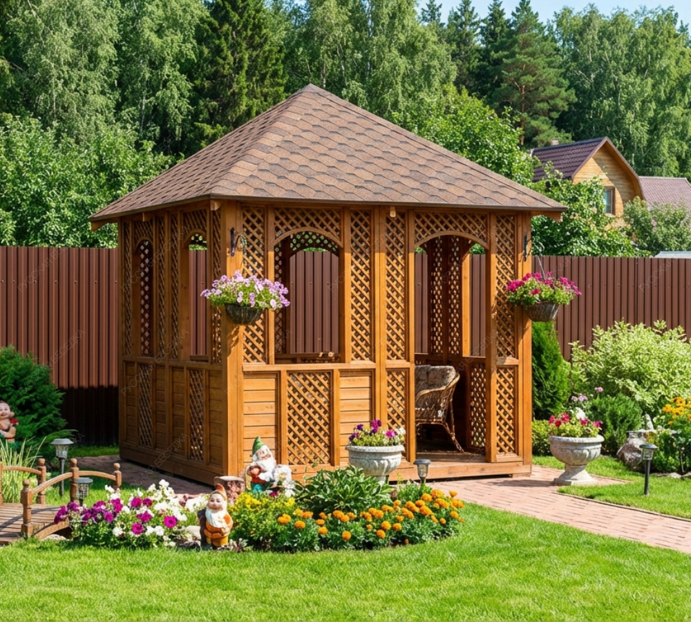 Современный ландшафтный дизайн и беседки - центральные элементы загородного участка. Беседка должна размещаться в таком месте участка, где вам будет комфортно находиться, а также она должна отвечать своему назначению и притягивать взгляды. Беседка является уникальным строением, с ее помощью можно отдохнуть за чашечкой кофе, укрыться от знойного солнца или провести шумный праздник в кругу семьи и друзей.