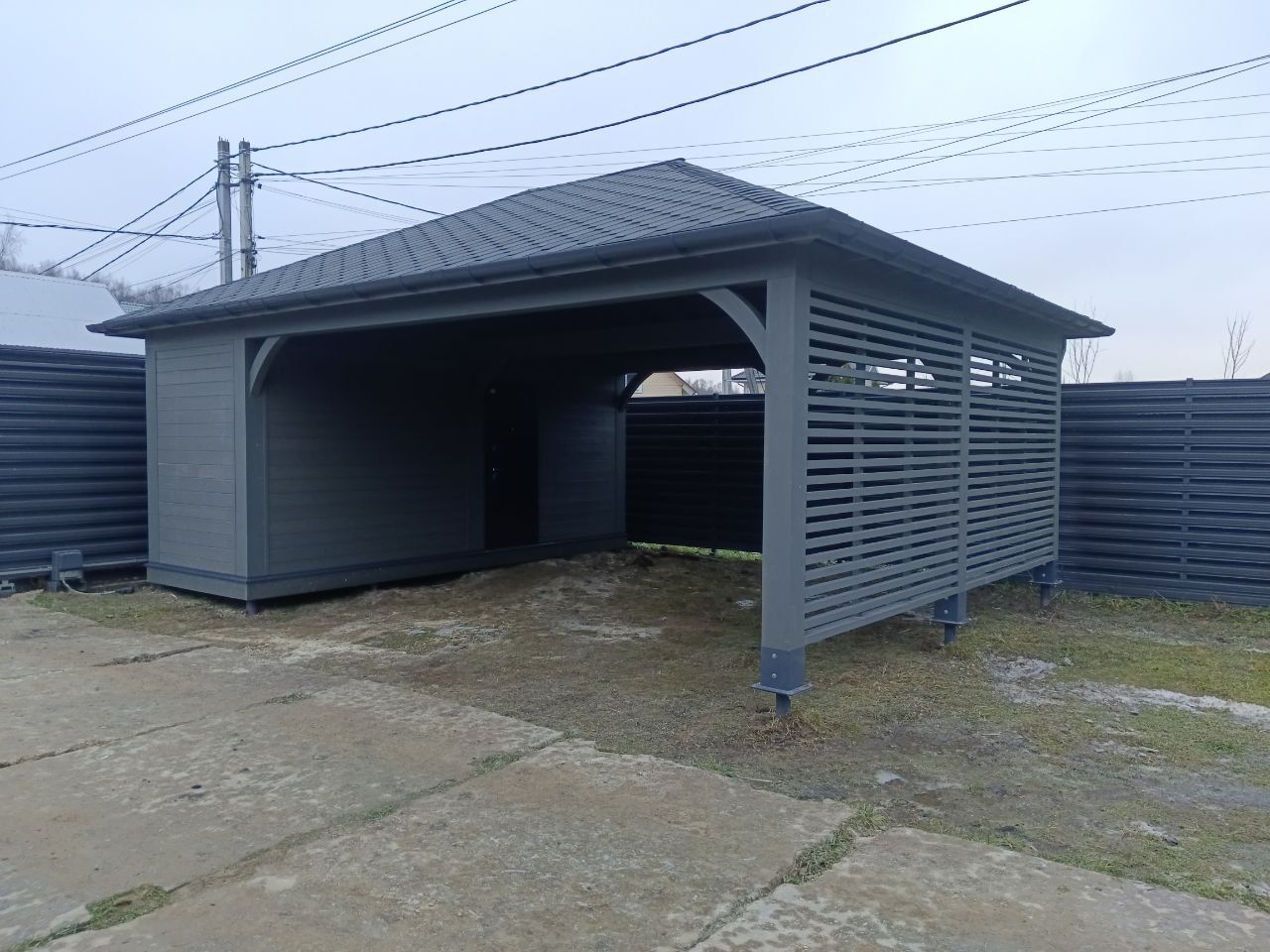 Навес из дерева послужит отличным парковочным местом для одного или нескольких автомобилей.