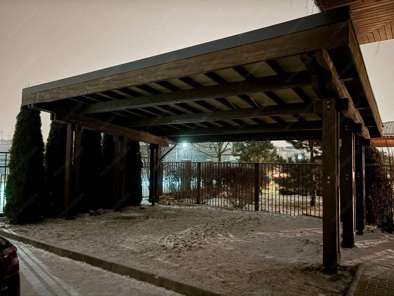 Навес из дерева послужит отличным парковочным местом для одного или нескольких автомобилей.