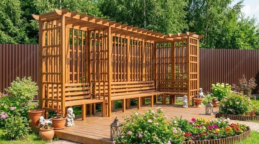 Пергола с навесом обеспечивает надежную защиту от солнечных лучей, создавая тенистое пространство для отдыха. Она станет идеальным местом для встреч с друзьями, чтения книг или приема пищи на свежем воздухе.