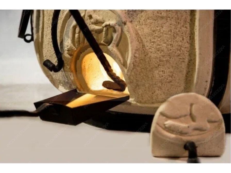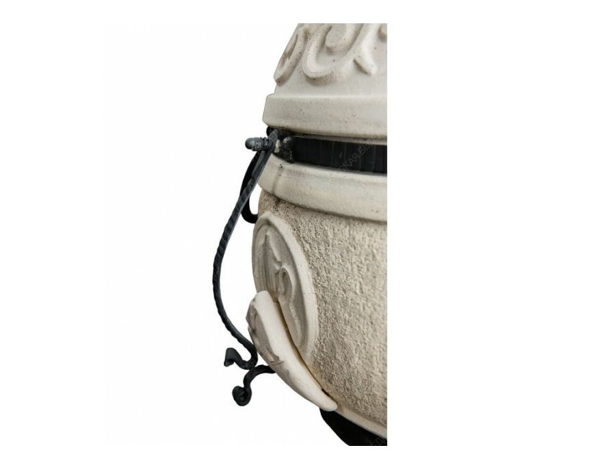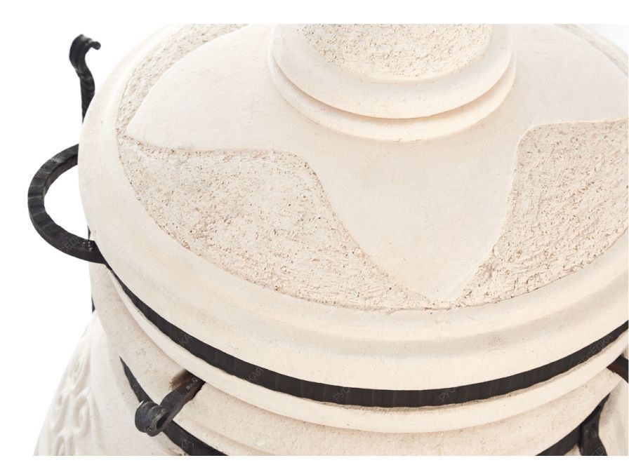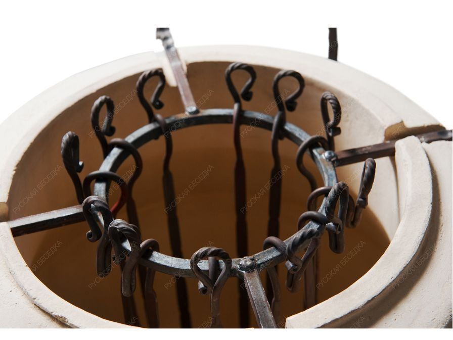 Широкая и уплощенная форма дна позволяет закладывать большее количество дров. При толщине стен в 5,5 см обеспечивается равномерный жар на 1,5 – 2 часа. Этого времени достаточно для приготовления еды без дополнительной растопки в несколько заходов. Внутренний объем вмещает 12 шампуров, а благодаря металлическому каркасу с коваными ручками, его можно легко переносить с места на место.